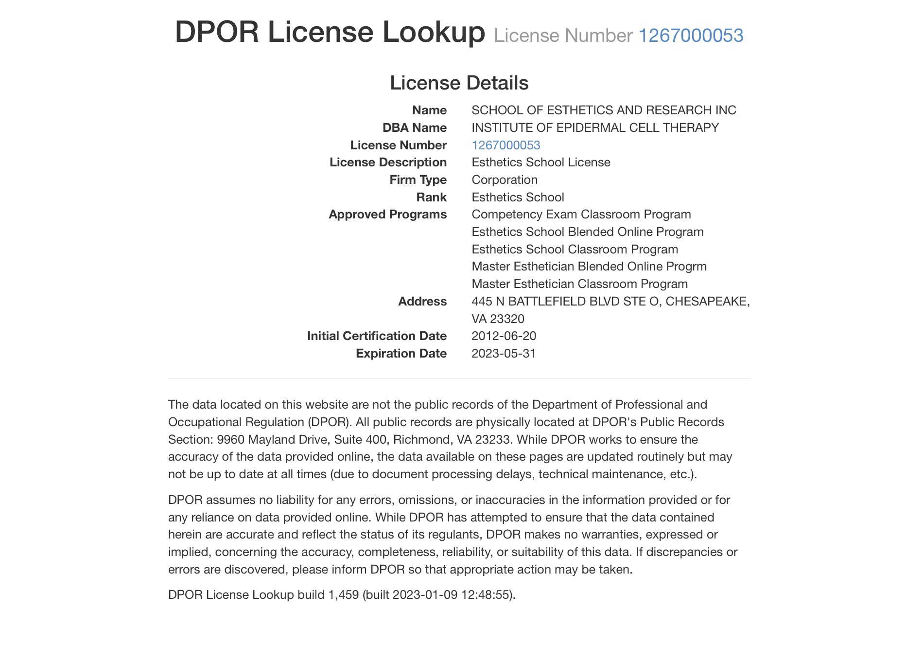 Our school is licensed to operate by the Virginia Department of Professional and Occupational Regulation Board for Barbers and Cosmetology. We have been trading since 2012 as The Institute of Epidermal Cell Therapy. Our Esthetics School License Number is 1267000053.